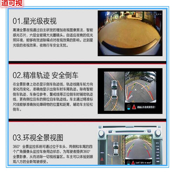 道可視1080P超清版360度全景行車輔助系統擁有更高的清晰度;軌跡線誤差小于5厘米;6大行車輔助功能,讓你行車更安全。我想大家不愿意遇到的就是當有些強行變道剮蹭到自己愛車后逃之夭夭,原本以為行車記錄儀可以拍攝到車牌號碼,結果取證時卻發現只剩一片模糊...分辨率低、夜晚拍攝能力差,取景角度太小這些問題一直都是不正規行車記錄儀為常見的問題,貪一時便宜有時候損失可是相當大的。