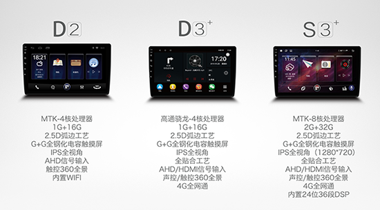 道可視4G車載影音導航系統D2、D3+、S3+的集體亮相也是一大亮點,2.5D弧面屏、IPS全視角高清大屏、G+G觸摸屏的加入,擁有更清晰流暢的畫質和更強的影像播放顯示,彰顯不凡氣質。