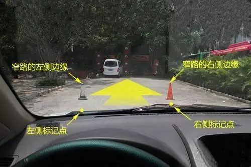 在車子慢慢靠近窄道的過程中,只要不讓兩側的邊緣在這兩個點的范圍內,那就是可以安全通過的。