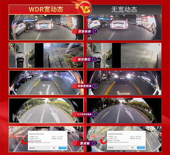 在實測中,我們將有WDR和無WDR的視頻做了對比,對比發現,有WDR的視頻里,車牌更清晰,盲區更清晰,夜晚更明亮,畫質更細膩,有效地解決了生活中攝像頭遇到汽車大燈等強光時,畫面曝光、眩光等問題。