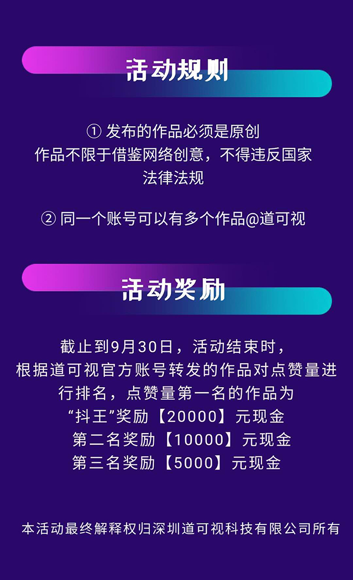 2020道可視“抖王”爭霸賽第一季截止到9月31日,活動結束時,根據道可視官方賬號轉發的作品對點贊量進行排名,點贊量第一名的作品為“抖王”獎勵【20000】元現金;第二名獎勵【10000】元現金;第三名獎勵【5000】元現金。