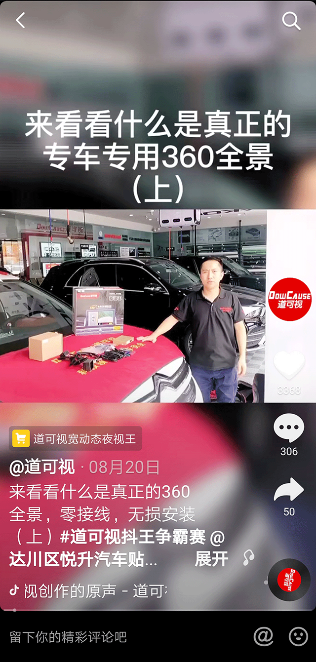 據道可視官抖顯示,截止至9月30日活動結束,道可視2020“抖王”爭霸賽第一季已獲得495.7W次的播放量,上傳的原創視頻有491個,來自全國各地的道可視代理商們紛紛曬出了自家的“寶貝”,掀起了一陣抖音曬360°全景的熱潮。