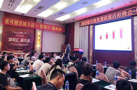 隨后,針對于大家所關注的“智慧聯(lián)盟店”,道可視大區(qū)經理伍招權進行了重點介紹,他從市場體系、加盟方案、銷售模式和加盟優(yōu)勢四個維度進行了詳細宣講,引起現(xiàn)場終端門店的極大興趣。